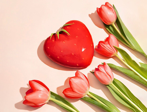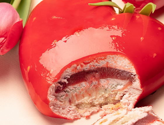 Свежий, будто бы слегка влажный вид клубнички мы создаем с помощью зеркальной глазури из белого шоколада.