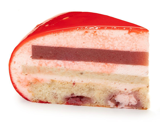 Начинка и мусс выложены на традиционный французский бисквит "Дакуаз", выпеченный из миндальной муки с добавлением кусочков клубники.