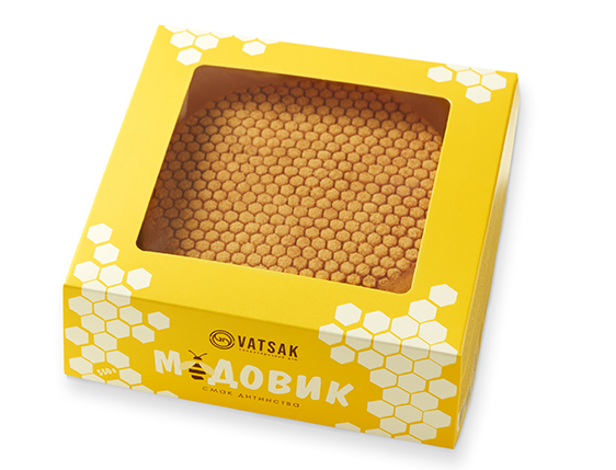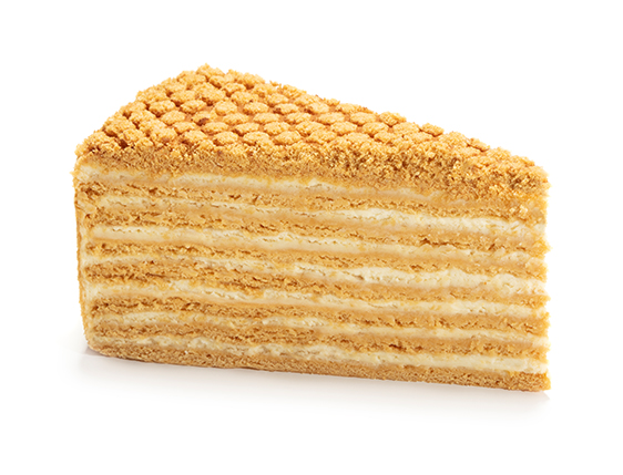Медовик по особому домашнему рецепту – ароматные медовые коржи из заварного теста, пропитанные кремом на основе крем-сыра с присущей ему кислинкой. В довершение – яркое послевкусие медового разнотравья.