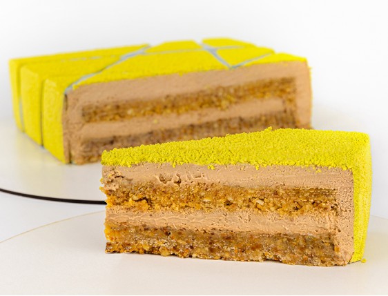 Яркий снаружи и внутри муссовый торт с велюровым покрытием в форме Магма с начинкой Фундук-Баваруа. Это десерт с многогранным вкусовым составом. Заварной крем Баваруа на молочном шоколаде с хрустящей прослойкой из фундука и карамели, выложены на крамбл на основе пралине с орехами миндаля и фундука.